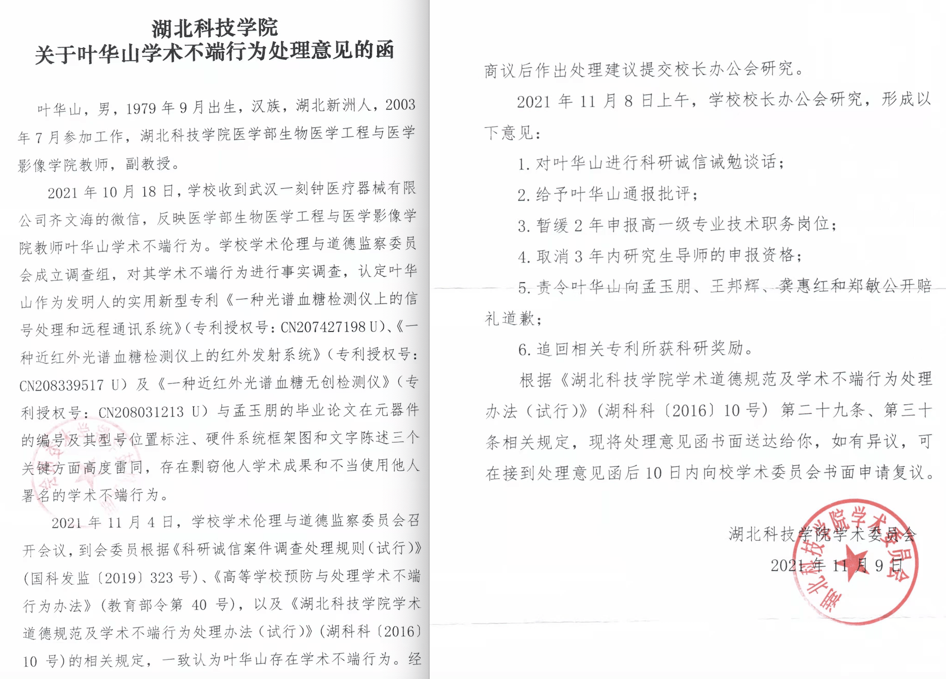 《一种光谱血糖检测仪上的信号处理和远程通讯系统》专利申报信息。国家知识产权局专利检索及分析官网 截图 11月9日,湖北科技学院学术委员会在内部公布了《湖北科技学院关于叶华山学术不端行为处理意见的函》,其中显示:学校学术伦理与道德监察委员会成立调查组,对叶华山学术不端行为进行事实调查,认定叶华山作为发明人的实用新型专利《一种光谱血糖检测仪上的信号处理和远程通讯系统》(专利授权号:CN207427198U)、《一种近红外光谱血糖检测仪上的红外发射系统》(专利授权号:CN208339517U)及《一种近红外光谱血糖无创检测仪》(专利授权号:CN208031213U)与孟玉朋的毕业论文在元器件的编号及其型号位置标注、硬件系统框架图和文字陈述三个关键方面高度雷同,存在剽窃他人学术成果和不当使用他人署名的学术不端行为。 校方针对叶华山的学术不端行为作出了以下处理,包括对叶华山进行科研诚信诫勉谈话;给予叶华山通报批评;暂缓2年申报高一级专业技术职务岗位;取消3年内研究生导师的申报资格;责令叶华山向孟玉朋、王邦辉、龚惠红和郑敏公开赔礼道歉;追回相关专利所获科研奖励。