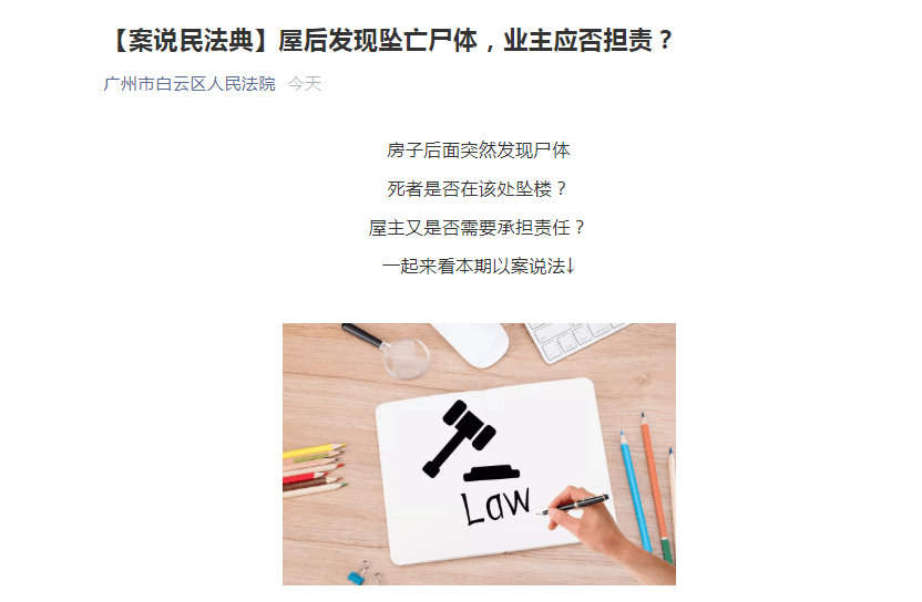 房子后面突然发现尸体死者是否在该处坠楼?屋主又是否需要承担责任? 11月3日,广州市白云区人民法院官方微信号公布了这样一起案件。