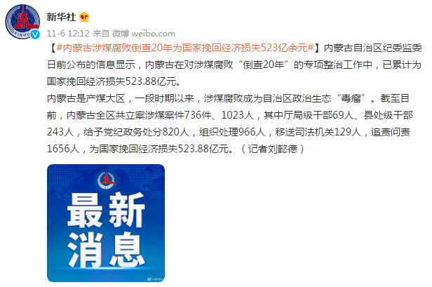 | 内蒙古涉煤腐败倒查20年为国家挽回经济损失523亿余元 | |||