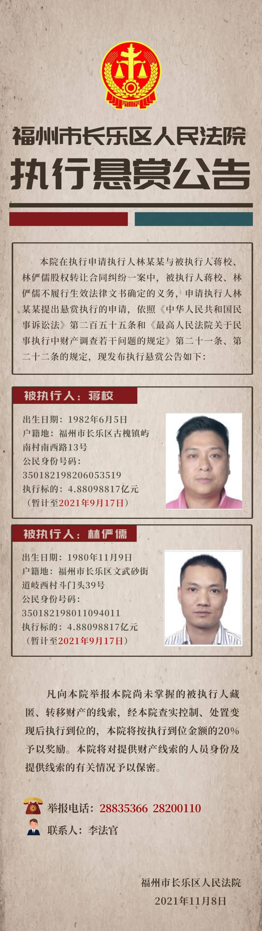 据悉,长乐法院在执行申请执行人林某某与被执行人蒋某、林某股权转让合同纠纷一案中,被执行人蒋某、林某不履行生效法律文书确定的义务,申请执行人林某某提出悬赏执行的申请。 依照《中华人民共和国民事诉讼法》第二百五十五条和《最高人民法院关于民事执行中财产调查若干问题的规定》第二十一条、第十二条的规定,长乐法院发布执行悬赏公告。 公告内容显示,被执行人蒋某,1982年6月出生,户籍地福州市长乐区古槐镇屿南村,执行标的4.88098817亿元(暂计至2021年9月17日);被执行人林某,1980年11月出生,户籍地福州市长乐区文武砂街道岐西村,执行标的4.88098817亿元(暂计至2021年9月17日)。 公告指出,凡向长乐区人民法院举报该院尚未掌握的被执行人藏匿、转移财产的线索,经该院查实控制、处置变现后执行到位的,该院将按执行到位金额的20%予以奖励。 法官介绍,此案执行标的约4.88亿元,按照执行标的总额的20%来算,悬赏总金额最高可达到9762万元。这是长乐法院有史以来赏金最多的执行悬赏公告。