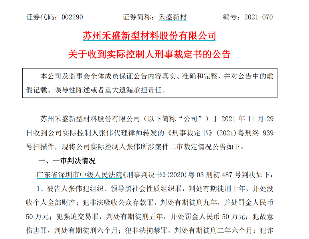 上市公司的实控人,居然是“黑老大”! 11月29日晚间,A股上市公司禾盛新材公告称,实控人张伟因组织领导“黑社会”、非法吸收公众存款、故意伤害等11项罪名,最终被判无期徒刑,没收个人全部财产,并处罚金1217万元。 上市公司实控人涉黑,被判无期徒刑 禾盛新材11月29日晚间公告,公司于2021年11月29日收到公司实际控制人张伟代理律师转发的《刑事裁定书》(2021)粤刑终939号扫描件:被告人张伟犯组织、领导黑社会性质组织罪,判处有期徒刑十年,并处没收个人全部财产;犯非法吸收公众存款罪,判处有期徒刑九年,并处罚金人民币50万元;犯强迫交易罪,判处有期徒刑五年,并处罚金人民币50万元;犯故意伤害罪,判处有期徒刑六个月;犯非法拘禁罪,判处有期徒刑二年六个月;犯诈骗罪,判处无期徒刑,剥夺政治权利终身,并处罚金人民币500万元;犯敲诈勒索罪,判处有期徒刑十五年,并处罚金人民币500万元;犯聚众斗殴罪,判处有期徒刑三年;犯寻衅滋事罪,判处有期徒刑七年,并处罚金人民币50万元;犯容留他人吸毒罪,判处有期徒刑二年,并处罚金人民币2万元;犯行贿罪,判处有期徒刑五年,并处罚金人民币65万元。 数罪并罚,决定执行无期徒刑,剥夺政治权利终身,并处没收个人全部财产,罚金人民币1217万元。本裁定为终审裁定。