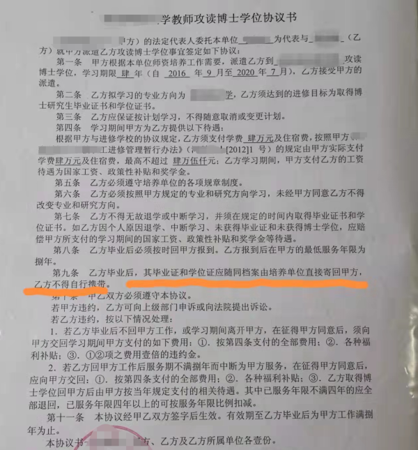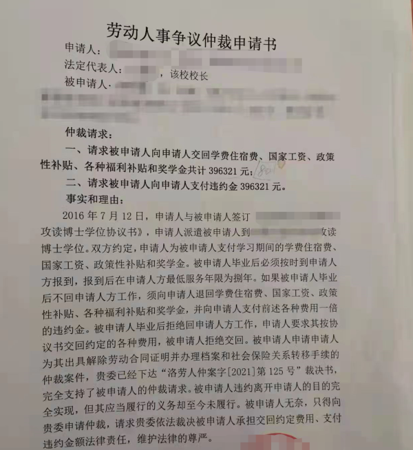 对此,11月30日,校方相关负责人向澎湃新闻表示,学校认为,是周寻违约在先,故不服前述仲裁结果,已诉至法院,请求撤销仲裁委裁决,因此,前述裁决暂未生效。目前,法院尚未判决。此外,学校根据此前与周寻签订的协议,向仲裁委申请由周寻赔偿学校支付的学费、住宿费、国家工资等费用396321元,以及协议约定的一倍违约金,合计792642元。 签读博协议后违约辞职,学校拒办档案手续 周寻称,她已在河南这所高校待了16年。2005年,她与学校签订《普通高等学校毕业生、毕业研究生就业协议书》,并于同年7月到学校任教,属于事业编制人员。 2016年,周寻与校方签订协议,攻读博士学位。 周寻提供的《教师攻读博士学位协议书》协议第四条显示,学校作为甲方派遣周寻攻读博士学位,学校为其提供学费、住宿费,支付的工资待遇为国家工资、政策性补贴和奖学金。 前述协议提到,乙方毕业后必须按时回甲方报到,最低服务年限为八年,若乙方毕业后不回甲方工作等,在征得甲方同意后,须向甲方交回学习期间甲方支付的如下费用:按第四条支付的全部费用;各种福利补贴;一、二项之费用壹倍的违约金。 该协议盖有公章和协议双方签名,落款时间为2016年7月12日。 周寻称,2019年9月,在读博即将毕业之际,她因个人原因提出辞职被拒,2020年12月,她再次向校方提出辞职,经过校长办公会讨论,同意其离职,同时于2021年2月开始停止为申请人发放工资和缴纳社会保险。此后,周寻多次要求学校办理档案和关系的转出以及解除劳动合同证明,均被拒。 周寻称,虽然后来学校同意她离职,但迟迟不转出档案和关系,造成她无法就业,失去经济来源。 2021年11月30日,校方出具给澎湃新闻的书面回复称,按照《劳动合同法》第二十二条的规定(用人单位为劳动者提供专项培训费用,对其进行专业技术培训的,可以与该劳动者订立协议,约定服务期。劳动者违反服务期约定的,应当按照约定向用人单位支付违约金。违约金的数额不得超过用人单位提供的培训费用)以及《河南科技大学教师攻读博士学位协议书》,郭春娜应退回学校学费、住宿费、国家工资、政策性补贴、各种福利补贴、奖学金396321元及一倍的违约金396321元,两项合计共计792642元。本着人文关怀,学校只要求其退回(不含任何违约金)396321元。2021年1月,学校同意周寻结清费用后可办理离校手续,学校为其出具解除劳动合同证明并办理档案和社会保险关系转移手续等,但周寻拒绝退回有关费用,并申请了仲裁要求转出档案和关系。 7月22日,周寻向洛阳市劳动人事争议仲裁委员会申请仲裁。
