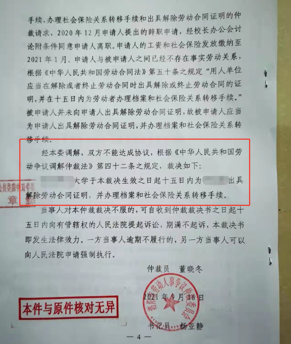 9月16日,仲裁委裁决如下:该校于本裁决生效之日起十五日内为其出具解除劳动合同证明,并办理档案和社会保险关系转移手续。 周寻称,学校未执行该裁决,并向法院申请撤销裁决。 周寻提供的盖有学校公章的《民事起诉状》也显示,9月29日,学校请求洛阳市洛龙区法院撤销洛阳市劳动人事争议仲裁委员会前述裁决书,判决驳回被告请求。该《民事起诉状》称,洛阳市劳动人事争议仲裁委员会下达的裁决书完全支持了被告的仲裁请求,但却没有考虑被告违约责任承担的问题,这显然是一个背离法律、显然不公平的裁决。前述文件盖有学校公章。 学校方面向澎湃新闻表示,该校依法向洛阳市洛龙区人民法院起诉,请求法院依法判决撤销该裁决。至此,洛阳市劳动人事争议仲裁委员会所做出的裁决书并不发生法律效力。