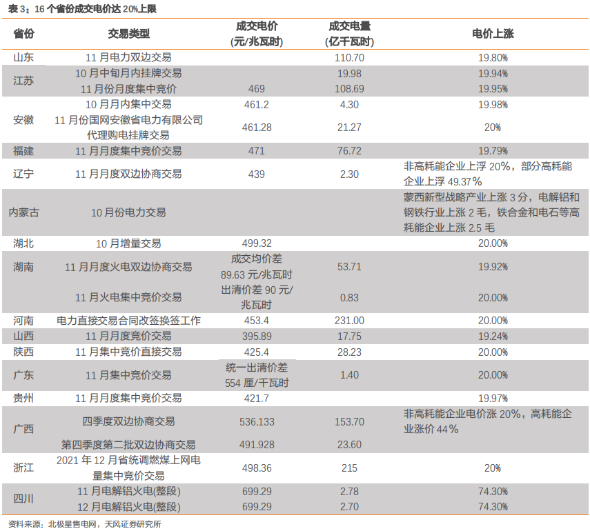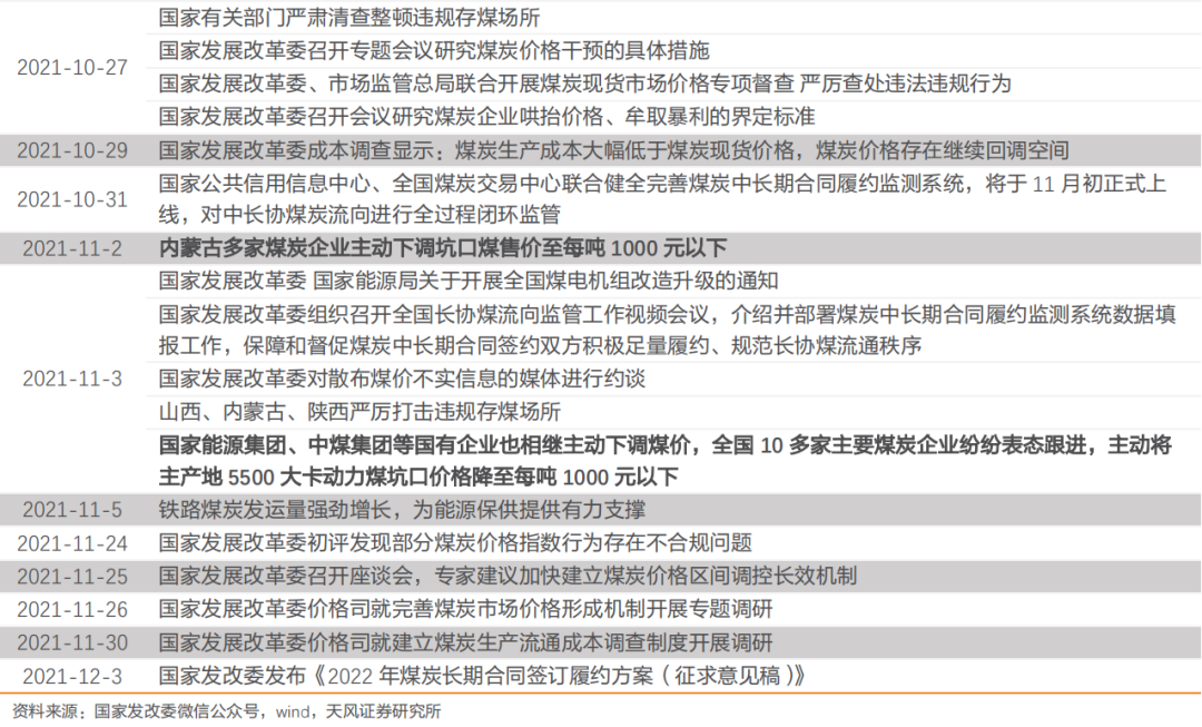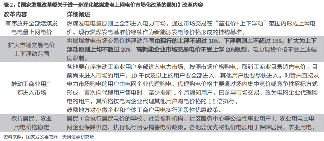 ![]() 12月3日,国家发改委发布《2022年煤炭长期合同签订履约方案(征求意见稿)》,煤炭长协基准价或将上调31%至700元/吨。2022年煤炭价格及电价走势引发市场广泛关注,天风研究所环保公用郭丽丽团队总结了以下四个问题并进行分析回答: (1)怎么判断2022年的煤炭价格? (2)怎么判断2022年的长协电价? (3)我们对于火电/新能源运营商的观点和看法 (4)火电资产的盈利拐点将于何时出现? ![]() 发改委多措并举、重拳出击,推动煤炭保供稳价。2021Q3煤炭价格快速上涨,连创新高,大幅推高下游行业生产成本。2021年10月19-22日,国家发改委公众号连发“十文”,稳煤价政策组合拳连续挥出。 ![]() ![]() 煤炭保供稳价的成效日益显现,煤炭产量较快增加,电厂存煤持续提升,煤炭价格逐步回落。 ![]() ①生产端,煤炭产量较快增加。2021年10月中国煤炭单月产量达3.57亿吨,同比+4.0%。从调度情况看,11月以来煤炭产量仍在稳步增长,根据兰州新闻网信息,11月10日中国煤炭调度日产量达1205万吨,创历史新高,较上一个峰值增加12万吨;其中,山西、陕西、新疆等多省区煤炭产量均创近年来新高,为全国能源保供稳价工作奠定了牢固的基础。 ![]() ②库存端,电厂存煤持续提升。电煤供应水平大幅提升,持续大于耗煤,电厂存煤快速回升。11月中下旬以来,电煤日均供煤达到860万吨,日均供煤大于耗煤近200万吨,电厂存煤继续快速增长。11月23日全国电厂存煤已达到1.47亿吨,其中国网区域电厂存煤已超过去年同期水平。 ![]() ③市场端,煤炭期现货价格大幅回落。10月19日以来,动力煤期货主力合约连续下跌,12月3日收于831.4元/吨,较10月19日高点1908.2元下跌56.43%。12月3日,秦皇岛港5500大卡动力煤现货平仓价降至1075元/吨,降幅接近1500元/吨,晋/陕主产区煤矿坑口价也分别降至820/980元/吨左右。 ![]() 2021年12月国家发改委就2022年煤炭长协签订征求意见,增强对煤炭供给侧调控、完善煤炭市场价格形成机制。意见稿明确,2022年的煤炭长协签订范围进一步扩大,核定能力在30万吨及以上的煤炭生产企业原则上均被纳入签订范围;在需求侧,要求发电供热企业除进口煤以外的用煤100%签订长协。同时,在价格方面,“基准价+浮动价”的定价机制不变,5500大卡动力煤调整区间在550-850元之间,其中下水煤长协基准价为700元/吨,较此前的535元上调约31%。 2022年煤炭价格有望逐步回归理性。政策助力煤炭供给充足,宏观经济企稳保障需求平稳,2022年煤炭供需有望改善,价格逐步回归理性区间。 供给端:政策频出推动煤炭保供稳价,煤炭产量持续增长。①发改委多措并举,煤炭保供稳价的成效日益显现:2021M10中国煤炭单月产量3.57亿吨,同比+4.0%;11月10日中国煤炭调度日产量达1205万吨,创历史新高。②国家发改委就2022年煤炭长协签订征求意见,上调长协基准价31%至700元/吨,增强对煤炭供给侧调控、完善煤炭市场价格形成机制,为全国能源保供稳价工作奠定了牢固的基础。 需求端:房地产行业政策回暖,宏观经济企稳,2022年煤炭需求相对平稳。11月12日,人民银行、银保监会分别召开党委会议。央行党委表示,要维护房地产市场平稳健康发展;银保监会表示,健全房地产调控长效机制,促进房地产业稳定健康发展。 ![]() ![]() 燃煤电价市场化改革再进一步,市场交易电价上下浮动范围扩大至20%。2021年10月12日,发改委印发《关于进一步深化燃煤发电上网电价市场化改革的通知》(发改价格〔2021〕1439号)。《通知》明确,燃煤发电的电量原则上要全部进入电力市场,通过市场交易,在“基准价+上下浮动”的范围内形成上网电价,将形成“市场煤”“市场电”的煤电市场格局。同时,扩大燃煤发电市场交易价格浮动的范围,由现行的上浮不超过10%、下浮原则上不超15%,扩大为上下浮动原则上均不超过20%,高耗能企业市场交易电价不受上浮20%限制。 ![]() 新一轮电价改革正式开启,电价涨价潮来袭,各地成交价格上涨幅度触及改革要求上限20%。其中山东省于10月15日完成了深化煤电上网电价市场化改革后的首次交易,11月电力双边协商交易成交电量110.7亿千瓦时,成交均价较基准电价上浮19.8%。此外,十余个省份高耗能行业电价上涨超过50%,其中四川电力交易中心组织完成2021年11-12月电解铝火电成交均价达到699.29元/兆瓦时,较燃煤基准价上涨74.3%。 ![]() 展望2022年,长协电价预计可以覆盖火电发电成本。①2022年煤炭价格有望下滑,带动火电企业发电成本下降。政策频出推动煤炭保供稳价,煤炭长协征求意见稿增加煤炭供给侧调控,2022年煤炭价格有望逐步回归理性区间。②随着电价上浮政策的落地,我们测算电价上浮20%后,火电企业盈亏平衡点将由800元/吨增至1000元/吨左右。2020年火电厂平均每千瓦时供电煤耗为320克标准煤(407.3克5500大卡动力煤),即5500大卡动力煤价格每上涨100元,火电厂发电成本提升0.04元/度。目前火电企业盈亏平衡点对应的煤炭成本为800元/吨,考虑电价在0.38元/度的基础上浮20%(即电价上浮0.076元/度)后,火电企业盈亏平衡点对应的煤炭成本将增至986.6元/吨。③随着电价上浮政策的落地,新一轮电价市场化改革开启,我们预计后期各省份电力市场化交易电价上涨幅度或将持续高位。同时伴随煤炭供给侧调控带动价格回落,我们预期2022年长协电价预计可以覆盖发电成本。 ![]() ![]() 电价上浮+煤炭长协价格区间锁定,火电公司基本面改善在即。一方面,保
