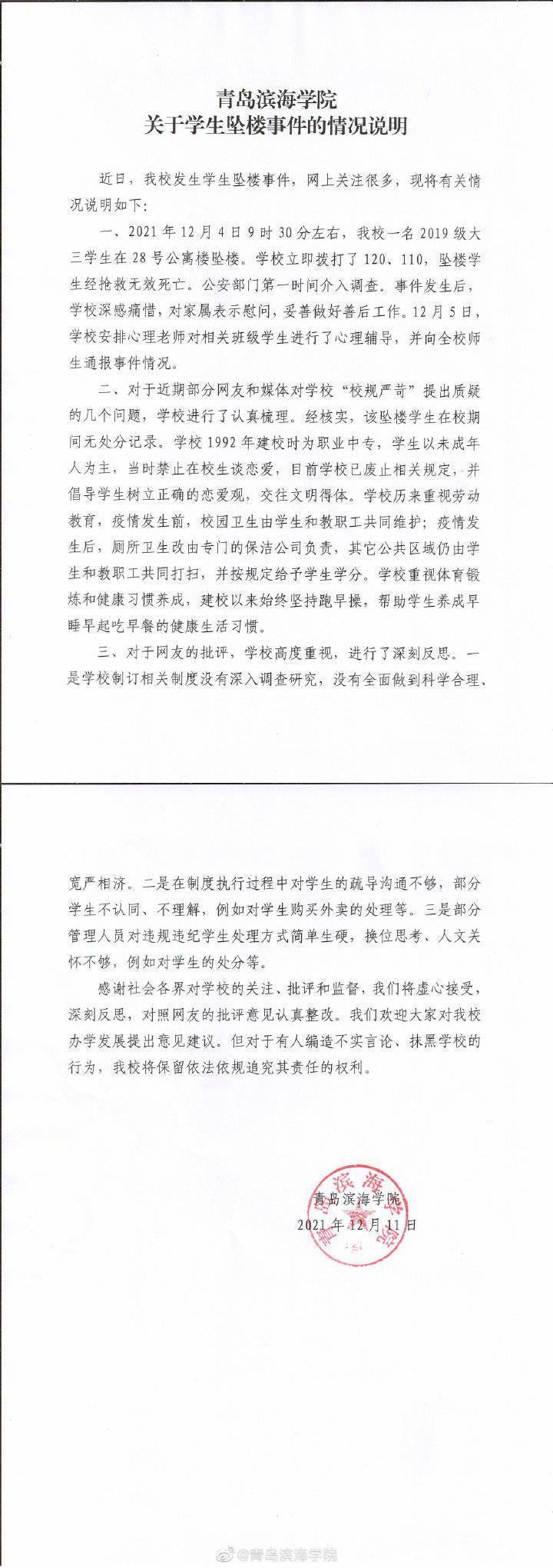 说明称,对于近期部分网友和媒体对学校“校规严苛”提出质疑的几个问题,学校进行了认真梳理。经核实,坠楼学生在校期间无处分记录。学校1992年建校时为职业中专,学生以未成年人为主,当时禁止在校生谈恋爱,目前学校已废止相关规定,并侣导学生树立正确的恋爱观,交往文明得体。学校历来重视劳动教育,疫情发生前,校园卫生由学生和教职工共同维护;疫情发生后,厕所卫生改由专门的保洁公司负责,其它公共区域仍由学生和教职工共同打扫,并按规定给予学生学分。学校重视体育锻炼和健康习惯养成,建校以来始终坚持跑早操,帮助学生养成早睡早起吃早餐的健康生活习惯。 青岛滨海学院在说明中表示,对于网友的批评,学校高度重视,进行了深刻反思。一是学校制订相关制度没有深入调查研究,没有全面做到科学合理、宽严相济。二是在制度执行过程中对学生的疏导沟通不够,部分学生不认同、不理解,例如对学生购买外卖的处理等。三是部分管理人员对违规违纪学生处理方式简单生硬,换位思考、人文关怀不够,例如对学生的处分等。 青岛滨海学院表示,欢迎大家对学校办学发展提出意见建议。对于有人编造不实言论、抹黑学校的行为,学校将保留依法依规追究其责任的权利。 澎湃新闻此前报道,12月4日早上网传青岛滨海学院有学生坠楼,该学生疑为外国语学院一名男生,12月7日上午,青岛市教育局一名工作人员告诉澎湃新闻,教育局已第一时间参与其中,指导学校进行相关工作,警方已经介入,正在调查。