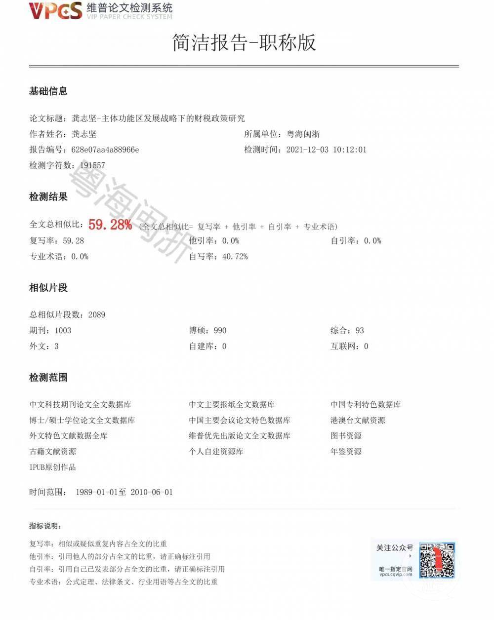 ▲龚志坚博士论文《主体功能区发展战略下的财税政策研究》中附带的独创性声明。图片来源/网页截图 李华向上游新闻记者提供的《主体功能区发展战略下的财税政策研究》查重报告单显示,该篇论文全文总相似比为59.28%,自写率40.72%,总相似片段2089段,检测字符数191557。 此外,龚志坚撰写论文《我国税收征纳交易费用的制度分析》经维普论文检测系统检测结果显示,全文总相似比为25.37%;龚志坚撰写论文《我国税收征管制度变迁的路径选择——基于税收征纳交易费用的分析》经维普论文检测系统检测,全文总相似比22.13%;龚志坚撰写论文《建设鄱阳湖生态经济区科学发展观的生动实践》,全文总字数4526字,经检测,全文总文字复制比73.6%。 “职称评定都有严格的流程,不管他往哪儿投(诉),都不会去介入(调查)。”12月16日,江西省社科院人事处副处长罗亨仁向上游新闻记者表示,此前,江西省社科院和职称评审委员会都收到了相关举报材料,他们认为龚志坚的职称评定没有问题,“他上哪儿举报是他的权利。” 罗亨仁介绍,龚志坚获评研究员高级专业技术资格经过了江西省人社厅随机从职称专家库抽调专家组成的职称评审委员会权威认定,省人社厅职称办是全程监管的。“根本就不存在为了谁去照顾谁这回事,不存在,这是一项很严肃的事情,不是通过网络什么的能够影响的。” “强中自有强中手,评职称就是这样的,基本材料都够,但每个人认为的侧重点是不一样的,而不是真的按照条例一下就能卡住的,不是这样的。”罗亨仁说,举报人李华也参加了此次职称评选,不过落选了。 江西省社科院官网于2021年11月29日公示的《2021年度哲学社会科学研究系列(高级)专业技术资格评审通过人员公示名单》显示,该名单共有17人,其中研究员5人,副研究员12人。名单中龚志坚获评研究员,其工作单位为江西省生态文明研究院,申报专业为经济学。