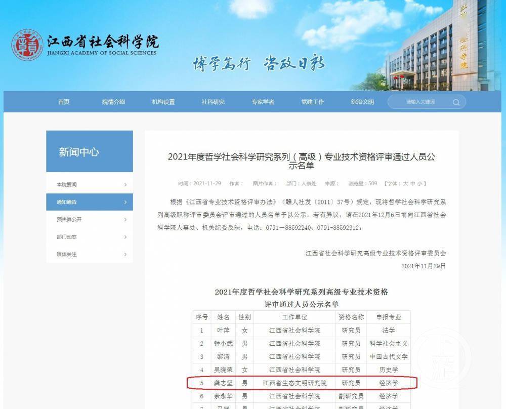 ▲江西省社科院2021年度哲学社会科学研究系列(高级)专业技术资格评审通过人员公示名单。图片来源/网页截图 记者了解到,龚志坚现任江西省生态文明研究院副院长。 据江西省生态文明研究院官网介绍,该院是经省委省政府批准,在省山江湖开发治理委员会办公室基础上,整合省发展改革研究院(《价格月刊》编辑部)、省鄱阳湖生态经济区规划馆及相关职责组建的副厅级公益一类事业单位,由江西省发展改革委管理,对外保留江西省山江湖开发治理委员会办公室牌子。