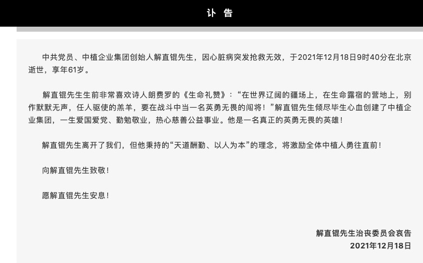 图据崂山频道新闻图片 解直锟因心脏病突然去世 从印刷厂工人到资本江湖大鳄 12月18日晚20时,中植企业集团发布讣告,中植企业集团创始人解直锟因心脏病突发抢救无效,猝然离世,享年61岁。 解直锟的离世十分突然,此前据财联社报道,消息人士称解直锟于12月17日晚间心脏病突发。讣告中称,解直锟于12月18日9时40分在北京逝世。