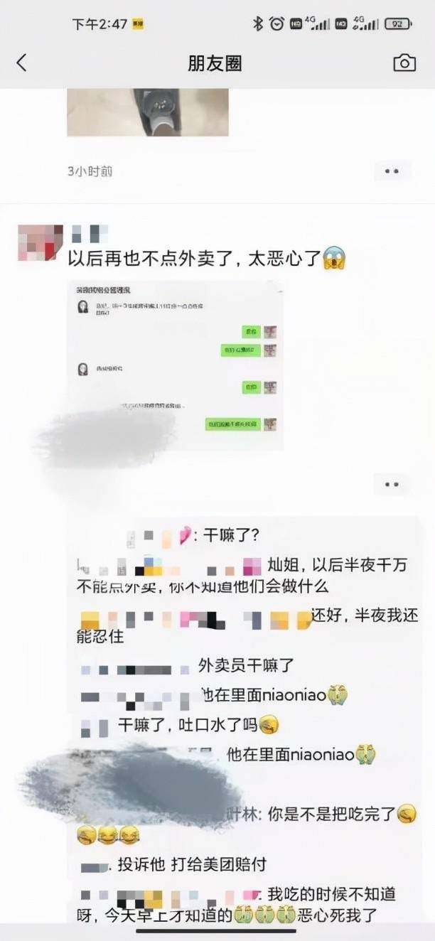 朋友圈截图。 视频和截图显示,小区物业正在和业主沟通。 物业询问业主是否在11月29日晚上11点左右点了份麻辣烫外卖,并表示从监控看到,外卖员好像对着业主的外卖做了些不可描述的行为。 在另一张朋友圈截图内,该业主表示再也不点外卖了。有人留言问她是不是外卖员吐了口水,该业主表示是外卖员在其外卖里小便。 同时,网上有人说,应该投诉至美团。美团的一名客服回应记者称,已向上级反馈,将和相关部门进行沟通,如果查证属实会进一步处理。