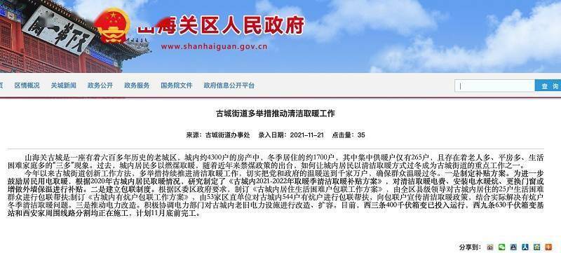 △山海关区政府官网对外发布的宣传信息(总台央广记者管昕截图) 当地政府官网发布的一则宣传稿也印证了这一点。 根据山海关区政府官网12月7日发布的消息称,区行政审批局主要领导亲自带队,现场办公,对人民胡同10号、兴顺胡同12、13号封炉灶进行“回头看”再封堵,坚决避免私自烧煤、烧柴行为发生。
