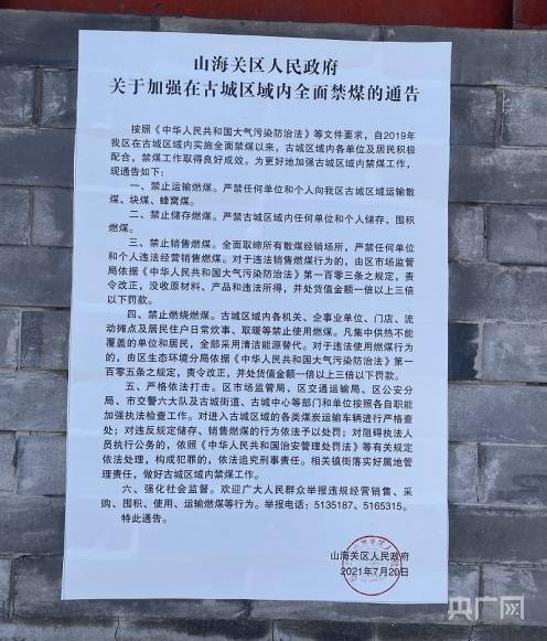 △山海关古城区域加强全面禁煤的政府通告(总台央广记者 管昕 摄) 根据2017年原环境保护部对外发布的《高污染燃料目录》,工业废弃物和垃圾、农林剩余物、餐饮业使用的木炭等辅助性燃料均不属于目录管控范围。此外,记者查询秦皇岛市政府和山海关区政府官网,当地和有关部门从未发布过禁止烧柴取暖的通告。 虽然山海关在印发的文件中,从未禁止烧柴取暖,但在实际操作中,却口头明令禁止。18日,记者以古城居民为名,电话联系到山海关区清洁取暖服务保障热线。值班人员明确表示,古城内不准烧柴,这是区里规定的。 值班人员:城里不让烧柴火,这区里有规定,影响大气污染。 记者:如果说家里面特别冷的话,你们能想办法救助一下吗? 值班人员:我们也没有办法。咱城里都这样,我们家也城里的,我妈我爸也城里住,我们家也有电暖器,那没办法,到冬天我妈我爸就上我家住来了。确实都反映,但是咱这也没办法,也不是说一下能解决的,咱自个暂时先想想办法吧。 山海关区隶属于河北省秦皇岛市,而秦皇岛市清洁取暖服务保障热线的值班人员告诉记者,目前,全市农村可以正常烧柴取暖。比如记者走访到的北戴河区甘各庄村、海港区北杨庄村等地,均可烧柴或者其他生物质能取暖。 为何山海关古城禁止烧柴取暖?虽然山海区政府的相关领导对记者表示,古城内不让烧柴,只是倡导,不是强制禁止。但记者追问为何封堵炉灶,相关人员却始终回避,未正面解释。 当地一位干部告诉记者,禁止烧柴取暖、封堵炉灶,相关领导干部明知这不符合政策要求,但仍然强制执行,根本原因是古城内有国家级大气监测国控点位,为了数字好看,区里只能环保管控层层加码。“晚上七八点钟工作人员看谁家冒烟去敲门,人家都不给开门,就知道你去了不干别的事,就告诉人家别烧了,老百姓就一句话,我太冷了。” 知情干部还告诉记者,不仅仅是古城内,山海关古城外的其他村庄,目前可以正常烧柴,但临近古城国控监测点位的一个村庄,也不让烧柴和其他生物质,就是为了确保监测点位的环保数据达标。“就是为了想尽一些办法把数值降下来。现在就是不让老百姓烧柴,就为了12月份最后一个月的数据,每年都这样,去年也是这样,今年可能达不到环保任务,所以管控更严了。” 山海关区一位要求匿名的领导干部对记者表示,古城内国控点位的环保数据,如果不好看,确实让主要领导压力非常大。 为确保古城居民冬季取暖,当地对外宣称,制定补贴方案,推动电力改造,还建立了包联帮扶制度。其中提到,由53家区直单位对古城内544户有炕户进行包联帮扶。知情的干部告诉记者,所谓的帮扶困难户和有炕户,实为管控,严防死守,禁止烧柴取暖。“为什么专对有炕户进行包联呢?就是因为有炕,老百姓才会烧。就是要对这些人进行包联,就是劝服。这些(宣传)信息就是这么冠冕堂皇,没有实打实的内容。”