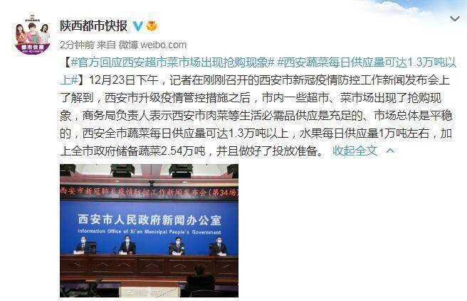 【#官方回应西安超市菜市场出现抢购现象# #西安蔬菜每日供应量可达1.3万吨以上#】12月23日下午,记者在刚刚召开的西安市新冠疫情防控工作新闻发布会上了解到,西安市升级疫情管控措施之后,市内一些超市、菜市场出现了抢购现象,商务局负责人表示西安市肉菜等生活必需品供应是充足的、市场总体是平稳的,西安全市蔬菜每日供应量可达1.3万吨以上,水果每日供应量1万吨左右,加上全市政府储备蔬菜2.54万吨,并且做好了投放准备。