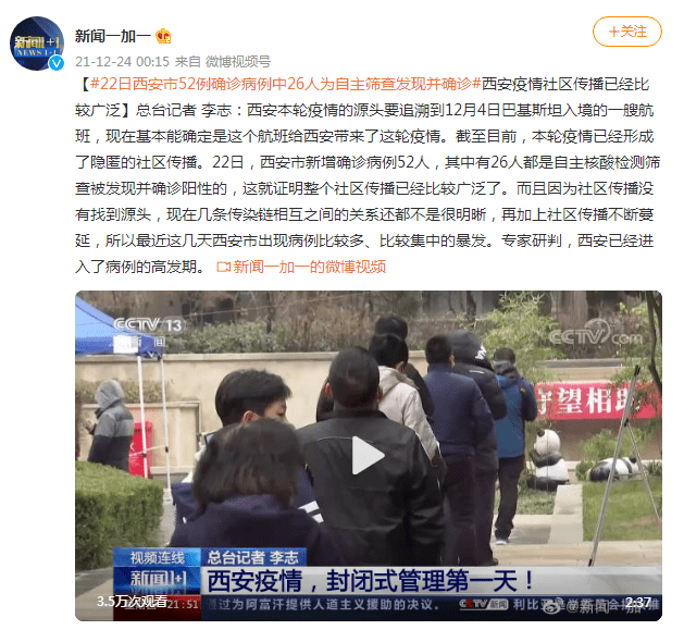 据央视新闻一加一微博消息,目前,西安疫情社区传播已经比较广泛,西安本轮疫情的源头要追溯到12月4日巴基斯坦入境的一艘航班,现在基本能确定是这个航班给西安带来了这轮疫情。 截至目前,本轮疫情已经形成了隐匿的社区传播。