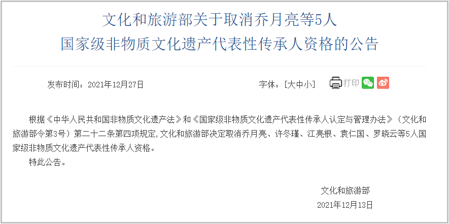 12月27日,文化和旅游部发布公告称,根据《中华人民共和国非物质文化遗产法》和《国家级非物质文化遗产代表性传承人认定与管理办法》(文化和旅游部令第3号)第二十二条第四项规定,文化和旅游部决定取消乔月亮、许冬瑾、江亮根、袁仁国、罗晓云等5人国家级非物质文化遗产代表性传承人资格。