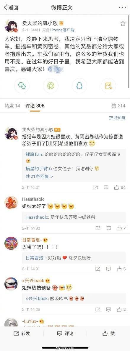 大年三十中午,5亿人围观的福禄娃开奖,江苏姑娘“卖火柴的凤小歌”被200万分之一概率的好运砸中,成为牛年第一锦鲤。奖品包括一头牛、清空购物车、汽车、飞天茅台等价值百万的年货。令人意外的是她决定舍弃大部分奖品,希望分给最需要的人、把幸运传递下去,并表示这是冷静思考的决定。 “卖火柴的凤小歌”在微博上写道:“大家好,冷静下来思考,我决定只留下清空购物车、摇摇车和黄冈密卷,其他的奖品都分给大家或者捐赠出去。车我们家里有,这么多的年货我们也用不完。在过年的好日子里,我希望大家都能沾到喜庆。感谢大家!” “摇摇车是因为娃很喜欢,黄冈密卷就作为惊喜送给孩子们了,希望他们喜欢。”