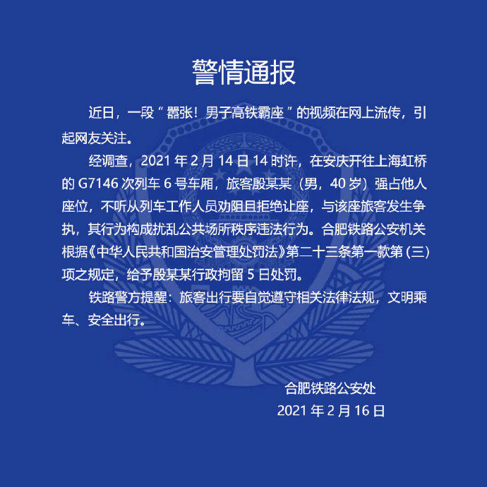 据合肥铁路公安处官方微博2月16日通报,近日,一段“嚣张!男子高铁霸座"的视频在网上流传,引起网友关注。 经调查,2021年2月14日14时许,在安庆开往上海虹桥的G7146次列车6号车厢,旅客殷某某(男,40岁)强占他人座位,不听从列车工作人员劝阻且拒绝让座,与该座旅客发生争执,其行为构成扰乱公共场所秩序违法行为。合肥铁路公安机关根据《中华人民共和国治安管理处罚法》第二十三条第一款第(三)项之规定,给予殷某某行政拘留5日处罚。 铁路警方提醒:旅客出行要自觉遵守相关法律法规,文明乘车、安全出行。