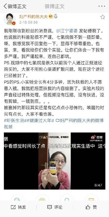 被害人陈姑娘家境贫寒,母亲是聋哑人,父亲在她小时候遗弃母女俩出走。靠母亲含辛茹苦的养育,陈姑娘得以大学毕业,哪知道刚入职场就遭遇其上司的圈套。从现有的信息看,彭某有可能在强奸陈某梅的过程前后,使用了包括七氟烷在内的麻醉药,在施行罪行中导致陈某梅死亡。 在这起案件中,强奸和谋杀究竟是如何发生的,还有待警方透露更多的案情才能有定论。但警方确认麻醉药七氟烷在本案中的关键作用,让人不寒而栗。此前,人们批评的是这种麻醉药是如何让犯罪分子轻易获取的,希望揪出并严惩卖药给彭某的上家,但科普博主与警员的个人自媒体之争,暴露了更可怕的问题。 有着220万粉丝的网红医生@妇产科的陈大夫 为了验证七氟烷的麻醉效果,用从正规渠道(从兽医处获得,本准备给宠物做手术用)得到的七氟烷捂住口鼻,很快就晕倒在地。目前,这一亲身试验的视频已经删除,陈大夫也向警方备案,做实验剩余的七氟烷已经被派出所妥善处理。 陈大夫这个亲身试药的视频公布后,具有警员个人自媒体背景的@江宁婆婆 谴责了陈大夫,认为警方早就一再强调,不存在“一捂就晕”的麻药,陈大夫对试验的描述有夸大嫌疑,容易引发恐慌。而陈大夫和许多医学科普博主则认为,对方辩友有抠字眼的嫌疑,到底是不是“一捂就晕”不是问题的要害。