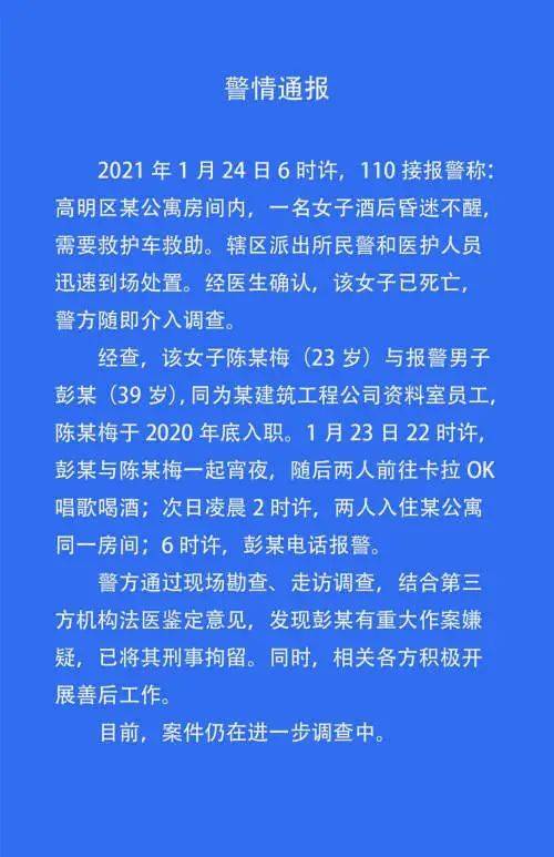 日前,“佛山新入职女员工酒店内死亡”一案引发关注,媒体报道受害女性被下药的作案手法影响恶劣、国内少见,警方尸检鉴定书中“七氟烷中毒”的细节引发医学科普博主们的讨论。有网红医生亲身实验,认为七氟烷“一捂就晕”,该结论受到@江宁婆婆 的驳斥。本起恶性案件所衍生的科普争论似乎掩盖了真问题。 2月9日,佛山市高明公安通报称,今年1月24日6时许,110接报警称:高明区某公寓房间内,一名女子酒后昏迷不醒,需要救护车救助。辖区派出所民警和医护人员迅速到场处置。经医生确认,该女子已死亡,警方随即介入调查。 经查,该女子陈某梅(23岁)与报警男子彭某(39岁),同为某建筑工程公司资料室员工,陈某梅于2020年底入职。1月23日22时许,彭某与陈某梅一起宵夜,随后两人前往卡拉OK唱歌喝酒;次日凌晨2时许,两人入住某公寓同一房间;6时许,彭某电话报警。警方通过现场勘查、走访调查,结合第三方机构法医鉴定意见,发现彭某有重大作案嫌疑,已将其刑事拘留。