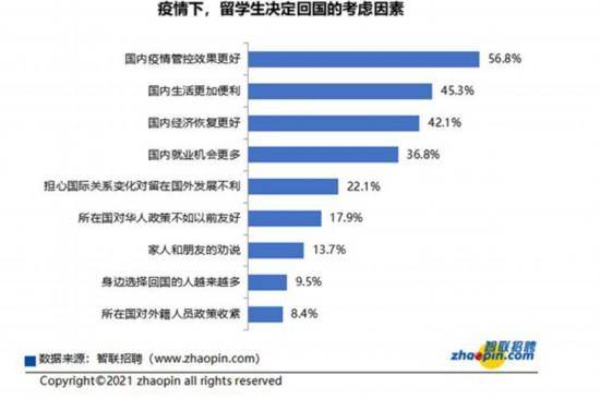 疫情下,国内疫情管控效果更好(56.8%)成为留学生决定回国的首要考虑因素,国内经济恢复更好(42.1%)、国内就业机会更多(36.8%)分列三四位。智联招聘供图 中新网上海2月24日电 题:疫情下中国留学生就业:回国趋势明显 过程曲折却充满信心 作者 刘晓 2021年一个阳光和煦的中午,2020年4月从英国回国的留学生书婕在上海虹口一家咖啡馆,享受着她所剩无几的待业时光。之前她刚刚结束了为期8个月的求职进程,选择与一家教育机构签订了就业合同。 书婕是疫情下选择回国就业的中国留学生群体的一员。去年年底,智联招聘发布《2020中国海归就业创业调查报告》(以下称《调查报告》)。《调查报告》显示:2020年向国内岗位投递简历(即有意在国内发展)的海归人才数量较2019年猛增33.9%,增幅远高于2019年(5.3%),其中应届生更是增长67.3%。留学生回国工作趋势明显。 时代的潮流裹挟下,留学生也感受到了属于这个群体别样的压力。高校不被认可、经历不相匹配、该群体大量回涌造成的同侪压力以及匹配职位的缩减都是这个群体需要承受的特殊阻力。 为此,作者采访了多名留学生,了解她们回国就业的过程,发现他们尽管过程颇具曲折性,凭借留学经历赋予的底气,留学生们依然对自己和中国的未来充满信心。 安全成为留学生回国的首要考虑因素 《调查报告》中显示,疫情下,国内疫情管控效果更好(56.8%)成为留学生决定回国的首要考虑因素,国内经济恢复更好(42.1%)、国内就业机会更多(36.8%)分列三四位。 高二出国,在英国读完本硕的书婕在疫情暴发前本来已经找好了一份联合国的工作,需要被派遣到第三世界国家,她不无遗憾地表示自己非常喜欢这份工作的内容和性质,但是考虑到第三世界国家的疫情管控和医疗卫生条件,还是在国内疫情稳定后选择了回国。另一位留学生阿乖,之前敲定的工作是英国本土的一家金融机构,“8月的时候爸妈说,如果我再不回国,他们只能亲自飞到英国把我带回来了。”阿乖最终就职于上海的一家教育机构。 留学生的就业困境:顶尖高校名头不响? 前程无忧发布的《2021毕业生需求调查》中显示,公司招聘应届毕业生最看重的三个筛选条件分别为:学校知名度、专业背景、实习经历。 很多综合实力强劲或者专业水平过硬的院校并不为国内企业所熟知,是造成留学生就业困难的一个重要原因。毕业于曼彻斯特大学的书婕笑称,她能较为顺利地找到工作,都是沾了足球的光,“HR至少都知道曼联和曼城这两支位于曼彻斯特的球队。”事实上,曼彻斯特大学是QS世界大学排名前30的名校。顶尖名校“名头”不响,来自湖北的小静也深有体会,她曾就读的伦敦大学学院是英国G5超级精英大学,在多个大学排行榜上高居世界前十,“这个学校在国外认可度很高,在国内实在没有知名度。大部分人听我说伦敦大学学院后一脸茫然,少部分人自动省略后面的学院,声称他们知道伦敦大学。可是真的没有伦敦大学啊!”小静无奈地笑道。 实习经历缺乏则是造成留学生就业困难的另一个原因。由于国情的差别,在国外的实习经历在国内企业看来“含金量”并没有那么足。谈到这里,尽管已经拿到了字节跳动的offer,小静仍然心有余悸:“幸好我回国找工作期间在美团实习过,去面试的时候,比起我在海外的求学和实习经历,HR们更为关注我在美团实习时做了什么、学到了什么。”“说实话在国内读研的同学实习经历都要比我丰富很多,所以现在工作的选择也比我多,单从就业层面考虑,去国外读研并不是一个好选择。” 在宏观层面上,国内知名招聘网站前程无忧的首席人力资源专家冯丽娟也谈到了一些今年留学生回国就业面临的困难:首先是就业时间晚,很多学生没办法及时回国;之前由于语言能力、培养方式等原因,跨国公司和留学生直接呈现一种乐于双向选择的状态,但今年全球经济受到影响,跨国公司在中国的招聘呈现收缩趋势;最后是留学生和国内企业的信息不对称性,造成留学生可以选择的职位比较窄。 留学生不乏自身的优势:求职意向、思维方式 当然,留学生回国就业时依然有自身优势。冯丽娟提到:“第一个,海外留学生硕士比例非常高,高学历的话,相对来讲找工作比本科生的优势还是明显的。第二个,海外留学生本身在求职的姿态上也要比国内的应届生要更积极主动。留学生归国的指向性非常明确,就是工作,他们的求职,意愿明显高于国内毕业生。海外留学生这种求职的频度性、他们的姿态、他们对于企业的经营状况的了解的意愿,都要更强烈。” 在与国内同龄人交流中,书婕发现他们往往缺乏一些个人规划和想法,她认为六年的海外求学经历带给自己的是思维方式和自我认知上的提升:“我并不惧怕疫情结束后重新出去,这是我之前六年生活带给我的底气。”书婕认为,留学带来的这些没法量化的优势,让自己更能认清想要怎样的工作,在找工作时可以目标明确:“我对工作待遇和稳定性并不是很看重,最看重的是公司所在行业的未来发展前景,以及工作性质能不能让我学到东西。”她认为自己在找工作时并没有遇到太多困难:“找工作最主要还是要看自我定位和自我提升能力,如果你本身是一个想得清楚、有目的、主动性强的人,找工作并不难。” 经历疫情依旧满怀信心 《调查报告》中71.5%的“95后”留学生表示,经历疫情,对国内经济发展与就业更加有信