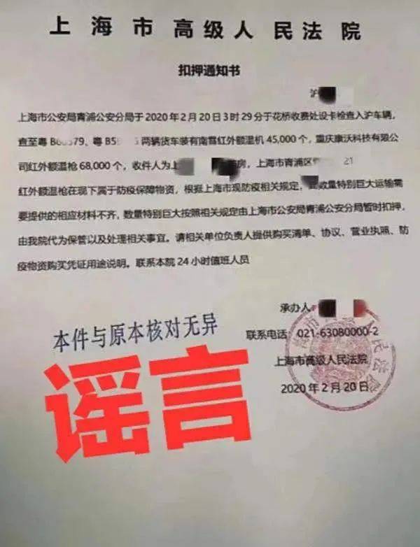 蒋某在朋友圈发布的广告 几天后,买家见蒋某迟迟不发货,纷纷要求退款,蒋某便拆东墙补西墙,一边继续发布虚假广告骗人购买,一边又把骗来的钱款还给之前的买家。有几个买家实在催得紧,他便想出了一个“稳定军心”的办法。 自去年7月开始,蒋某一家因房子的动迁问题与他人产生纠纷,打过几次官司,因此,蒋某对法院出具的裁判文书的格式、类型较为熟悉。于是,蒋某在网上找人伪造了上海市高级人民法院(以下简称上海高院)的公章,并照葫芦画瓢伪造了一份《上海市高级人民法院扣押通知书》,上面写着:“红外额温枪现下属于防疫保障物资,根据上海市防疫相关规定,此数量特别巨大,运输需要提供的相应材料不齐,由青浦公安分局暂时扣押,由上海市高级人民法院代为保管以及处理相关事宜。”