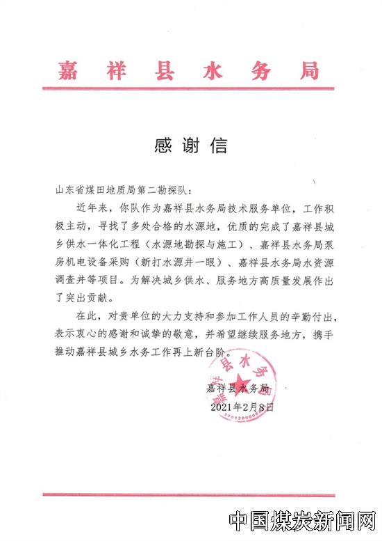 【本网讯】近日,山东省煤田地质局第二勘探队收到嘉祥县水务局发来的感谢信,信中对该队在推进嘉祥县城乡供水一体化工作中做出的突出贡献给予充分肯定,对参加工作的人员表示衷心的感谢!