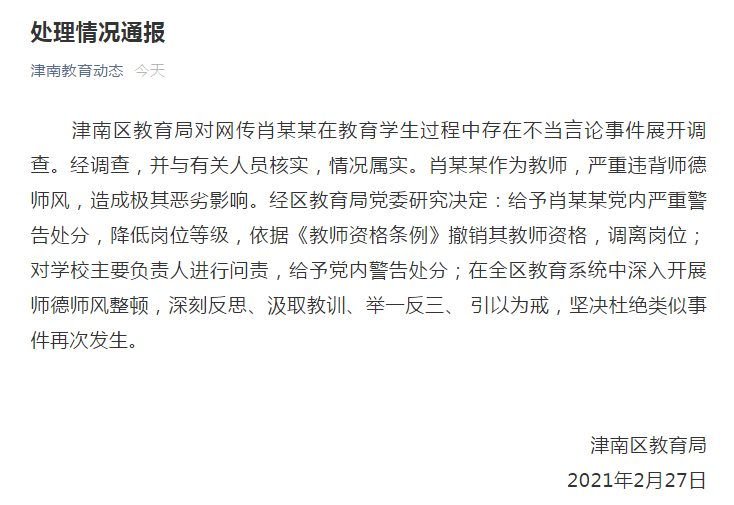 据津南教育动态微信公众号27日消息,津南区教育局对网传肖某某在教育学生过程中存在不当言论事件展开调查。经调查,并与有关人员核实,情况属实。肖某某作为教师,严重违背师德师风,造成极其恶劣影响。经区教育局党委研究决定:给予肖某某党内严重警告处分,降低岗位等级,依据《教师资格条例》撤销其教师资格,调离岗位;对学校主要负责人进行问责,给予党内警告处分;在全区教育系统中深入开展师德师风整顿,深刻反思、汲取教训、举一反三、 引以为戒,坚决杜绝类似事件再次发生。