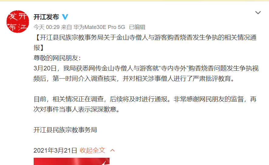 据开江发布官网微博今日凌晨消息,开江县民族宗教事务局关于金山寺僧人与游客购香烧香发生争执的相关情况通报 尊敬的网民朋友: 3月20日,我局获悉网传金山寺僧人与游客就“寺内寺外”购香烧香问题发生争执视频后,第一时间介入调查核实,并对相关涉事僧人进行了严肃批评教育。 目前,相关情况正在调查,后续将及时进行通报。非常感谢网民朋友的监督,再次对事件当事人表示深深歉意。 此前,一则网传视频显示,有一女子来到四川开江金山寺烧香拜佛时,女子点燃的香火被一僧人扔掉。僧人说,外面的香不能点,只能买寺庙里的香。女子反问:“谁规定的?”僧人:“你别管。”