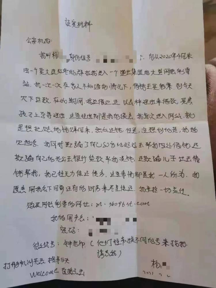 老师借钱原是为网络赌博欠下巨债自杀身亡 张建是在2021年1月1日发现事情不对的。杨某曾承诺2020年12月底还钱,1月1日张建从宁波返回抚顺后就找到杨某,希望她能提供孩子出国的担保金账户和基金账户等证明,但是杨某却什么也拿不出来。“她就一直说自己手头紧,也不说到底用这些钱干什么了。” 2021年春节期间,张建从朋友处得知,杨某自杀了。张建告诉记者,这位朋友的一位朋友正好认识杨某邻居,而这位邻居也是杨某借钱的受害者。 林红和李莉是在家长群得知的消息。此后不久,林红和李莉发现自己并非唯一给杨某借钱的家长,整个班级里有三十多个家长都给杨某借了钱,初步统计可能有117万之多。 李莉向记者出示了两份杨某手写证明材料。其中一份给公关机关的证明材料中,杨某称2020年4月,在一个卖红枣的微信群里,有人拉她进入一个大型彩票网站。她一次一次在家人不知情的情况下借钱去买彩票,直到欠下巨款。杨某称,她边借边还,以买房、孩子上学等各种理由借款。“我每次进入网站,就是想把赔的钱赚回来,然后还钱,但没想到的是,我越欠越多。” 丈夫:她还借了我二三十万 曾劝她自首 杨某丈夫证实手写证明材料的确系杨某本人所写。17日,杨某丈夫管先生告诉记者,他与杨某是重组家庭,两人登记结婚不过一年多时间。管先生称,自己刚认识杨某时,她是一名普通小学老师,没有任何不良嗜好,“不然我也不能和她结婚。” 管先生告诉记者,去年,杨某也多次向自己和自己的母亲借钱。“她就是跟我撒谎,说什么她哥哥要用钱,还有外面和别人做买卖借了些钱,到年底有人找她要钱还不上。”管先生称,自己想着夫妻俩一起过日子,能帮一把就帮一把,前后借给杨某二三十万元。此外,杨某还向自己的母亲借了不少钱。 但杨某网络赌博的事他则是今年快过年的时候才知道的。管先生告诉记者,得知杨某因为网络赌博欠下巨款后,他和杨某的儿子都劝她去自首,写给警方的证实材料也是他看着杨某写的,但是杨某并不愿意去自首,两人还决定等正月初七(2月18日)工作日就去离婚。因为赌博的事,管先生的母亲被气病,春节期间管先生一直照顾母亲没在家,没想到正月初五杨某就自杀身亡。“我要是早知道,还能让她去玩吗?她都是在我上班不在家的时候赌。” 管先生告诉记者,此前也有一些学生家长和其他借给杨某钱的人找他,但他都告诉对方走法律程序,“她赌博的事我不知道,这些钱也没有用于家庭建设。” 3月18日,记者从抚顺市教育局获悉,市教育局已获悉杨某的事,但具体处理情况由望花区教育局负责。多次联系望花区教育局,尚未获得有效回复。17日,处理此事的一位警方工作人员表示,已有多人因杨某借款到派出所报案,但此事系经济纠纷,目前警方只能登记,借款人可通过法院起诉。