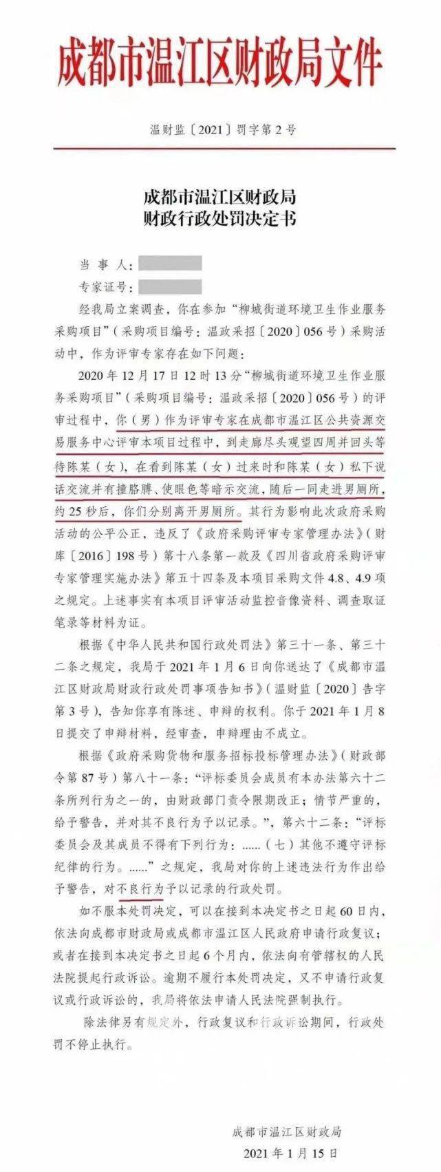招标采购项目一位男性评审专家,在评审过程中与一位女性私下交流,还一同走进男厕所?近日,一份成都市温江区财政局的行政处罚决定书在网上被曝光,其中显示,该局对这位评审专家作出给予警告,对不良行为予以记录的行政处罚。 成都市温江区公共资源交易服务中心一位业务科室工作人员3月19日向记者表示,确实有这个事,当天发现后第一时间就向上级监管部门上报了。 男评审与女子同入男厕25秒 网络曝光的成都市温江区财政局财政行政处罚决定书图片显示,当事人姓名和专家证号被隐去,内容中介绍,“经我局立案调查,你在参加‘柳城街道环境卫生作业服务采购项目 ’(采购项目编号:温政采招【2020】056号)采购活动中,作为评审专家存在如下问题:2020年12月17日12时13分‘柳城街道环境卫生作业服务采购项目’(采购项目编号:温政采招〔2020〕056号)的评审过程中,你(男)作为评审专家在成都市温江区公共资源交易服务中心评审本项目过程中,到走廊尽头观望四周并回头等待陈某(女),在看到陈某(女)过来时和陈某(女)私下说话交流并有撞胳膊、使眼色等暗示交流,随后一同走进男厕所,约25秒后,你们分别离开男厕所。”