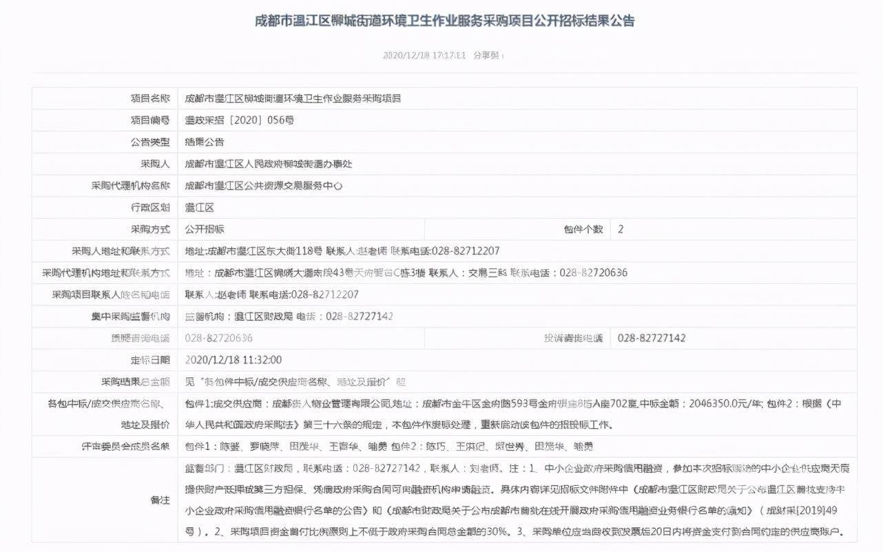 招标评审专家在评审过程中与他人私下交流引发舆论关注。3月18日,记者联系了成都市温江区财政局,求证网传文件的真假,工作人员在了解了记者采访要求后,未给予明确的答复,要求记者联系温江区委宣传部。 涉事项目已被废标 记者3月19日在成都市公共资源交易服务中心的网站上搜索“温江区柳城街道环境卫生作业服务采购项目”后发现,该项目2020年11月16日首次发布公开招标采购公告,采购人是成都市温江区人民政府柳城街道办事处,有两个包件,监督机构是温江区财政局。 记者查询了该项目的招投标文件后看到,包件1和包件2的项目名称相同,但预算金额不同。包件1的预算金额是2088111.6元/年,包件2的预算金额是2917280.88元/年。2020年12月18日,《成都市温江区柳城街道环境卫生作业服务采购项目公开招标结果公告》发布,公告中显示,该项目包件1:成交供应商是成都贵人物业管理有限公司,中标金额:2046350.0元/年;包件2:根据《中华人民共和国政府采购法》第三十六条的规定,本包件作废标处理,重新启动该包件的招投标工作。 该公告还公布了评审委员会成员名单,记者注意到,包件1和包件2的评审委员会名单各有5人,有2人同时出现在了两个包件的评审委员会名单中,其中1人是采购人代表。
