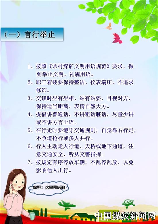 【本网讯】山西潞安化工集团常村煤矿在不断加强和深入推进文明创建过程中,以“人人遵章守纪,事事讲求精细,时时注重创新,处处体现和谐”为共同行为规范,大力推进精益管理、算帐文化、文明准则,培育了广大职工良好的行为习惯,狠抓了职工的日常行为规范,使职工能够对照标准不断修正和改善自身行为。到底是什么样的文明礼仪守则?让小编带您一起去寻求答案……