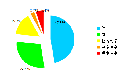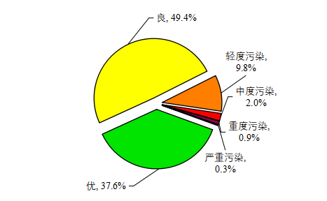 按照环境空气质量综合指数评价,168个重点城市中,环境空气质量相对较差的20个城市(从倒数第1名至倒数第20名)依次是安阳、石家庄、太原、唐山、邯郸、临汾、淄博、邢台、鹤壁、焦作、济南、枣庄、咸阳、运城、渭南、新乡、保定、阳泉、聊城、滨州和晋城市(滨州和晋城市并列倒数第20名),环境空气质量相对较好的20个城市(从第1名至第20名)依次是海口、拉萨、舟山、厦门、黄山、深圳、丽水、福州、惠州、贵阳、珠海、雅安、台州、中山、肇庆、昆明、南宁、遂宁、张家口和东莞市。 京津冀及周边地区“2+26”城市平均优良天数比例为63.5%,同比上升10.4个百分点;PM2.5年均浓度为51微克/立方米,同比下降10.5%。北京优良天数比例为75.4%,同比上升9.6个百分点;PM2.5年均浓度为38微克/立方米,同比下降9.5%。 长三角地区41个城市平均优良天数比例为85.2%,同比上升8.7个百分点;PM2.5年均浓度为35微克/立方米,同比下降14.6%。 汾渭平原11个城市平均优良天数比例为70.6%,同比上升8.9个百分点;PM2.5年均浓度为48微克/立方米,同比下降12.7%。 (二)酸雨 465个监测降水的城市(区、县)中,酸雨频率平均为10.3%,同比上升0.1个百分点。全国降水pH年均值范围为4.39~8.43。其中,酸雨(降水pH年均值低于5.6)城市比例为15.7%,同比下降1.2个百分点;较重酸雨(降水pH年均值低于5.0)城市比例为2.8%,同比下降1.7个百分点;重酸雨(降水pH年均值低于4.5)城市比例为0.2%,同比下降0.2个百分点。酸雨类型总体仍为硫酸型。 全国出现酸雨的区域面积约为46.6万平方千米,占国土面积的4.8%,同比下降0.2个百分点。主要分布在长江以南、云贵高原以东地区,包括浙江、上海的大部分地区、福建北部、江西中部、湖南中东部、广东中部、广西南部和重庆南部。 三、淡水 (一)地表水 1940个国家地表水考核断面中,水质优良(Ⅰ~Ⅲ类)断面比例为83.4%,同比上升8.5个百分点;劣Ⅴ类为0.6%,同比下降2.8个百分点。主要污染指标为化学需氧量、总磷和高锰酸盐指数。