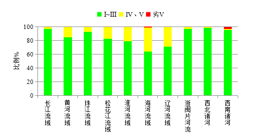 长江、黄河、珠江、松花江、淮河、海河、辽河等七大流域及浙闽片河流、西北诸河和西南诸河水质优良(Ⅰ~Ⅲ类)断面比例为87.4%,同比上升8.3个百分点;劣Ⅴ类断面比例为0.2%,同比下降2.8个百分点。 西北诸河、浙闽片河流、长江流域、西南诸河和珠江流域水质为优,黄河、松花江和淮河流域水质良好,辽河和海河流域为轻度污染。 ![]() 图3 2020年七大流域和浙闽片河流、西北诸河、西南诸河水质状况