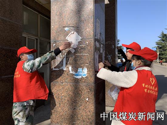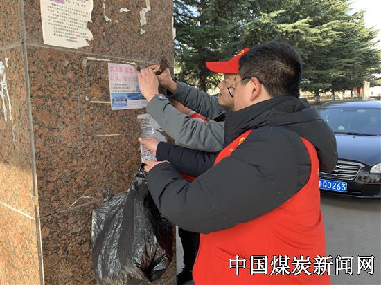 当天上午,该矿青年志愿者在确保矿区东大门、灯柱和宣传栏不损坏的前提下,分组对其上面的小广告进行铲除。在清理现场,有的用喷壶喷水,有的用批灰刀铲,还有的用钢丝球擦。喷水后,大片容易撕掉的,直接撕掉。还有一些粘贴牢固不易清理的,大家先用批灰刀等工具铲,然后再用手一点一点将其撕掉,不放过任何一个死角。铲除小组的志愿者们手酸了,喷水小组的志愿者们就顶上。他们合理分工,努力铲除小广告。