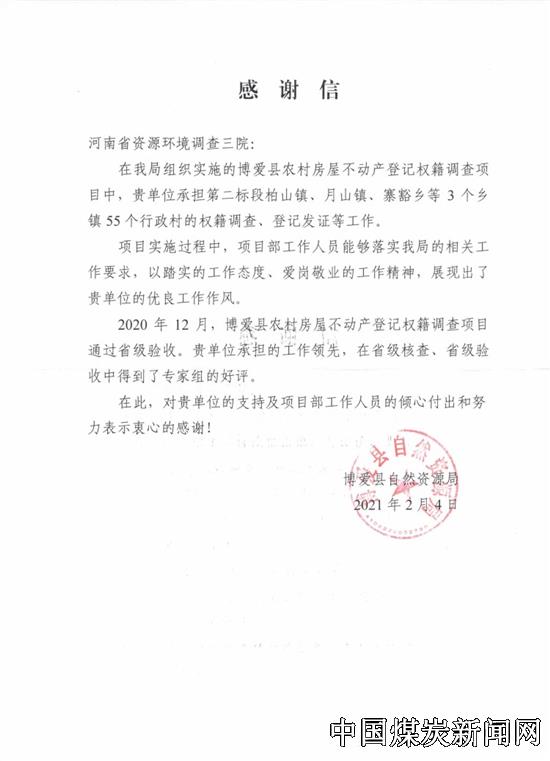 河南省资源环境调查三院收到一封感谢信