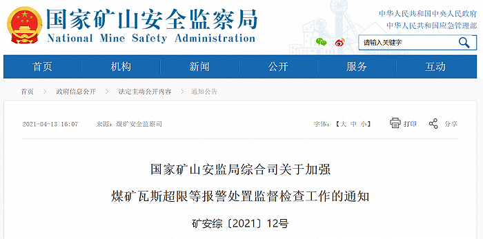 | 国家矿山安监局:加强煤矿瓦斯超限等报警处置监督检查工作 | |||