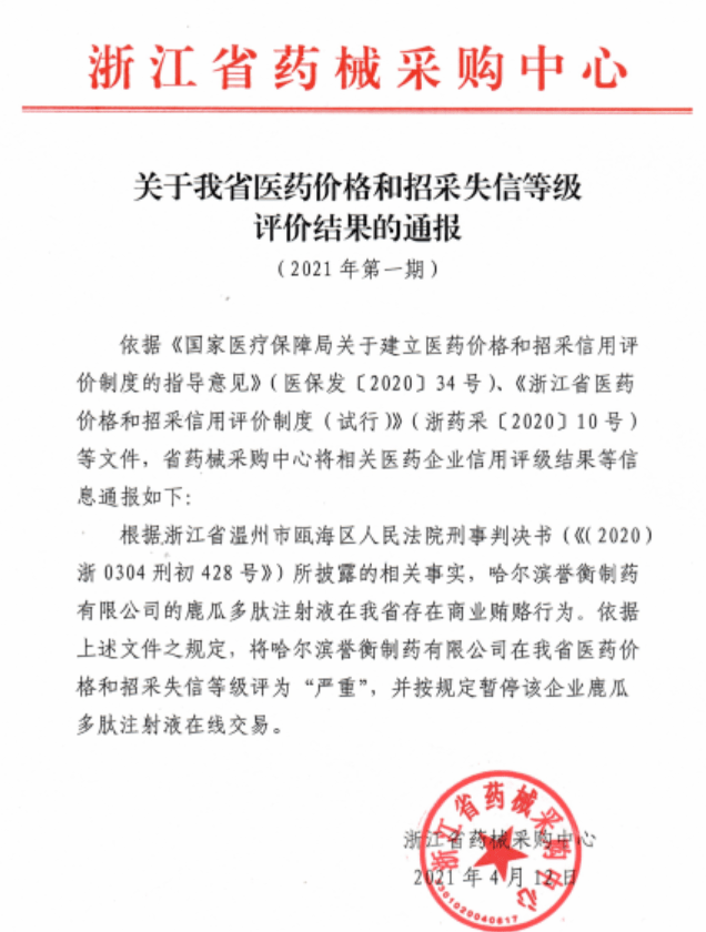 近期,医药圈接连“地震”。 先是4月12日,财政部发布会计信息质量检查公告称,对财政部有关监管局检查的19家医药企业作出行政处罚,其中涉及恒瑞医药、步长制药、豪森药业、礼来、赛诺菲等多家知名药企。公告显示,被处罚的19家医药企业存在使用虚假发票、票据套取资金体外使用,虚构业务事项或利用医药推广公司套取资金,账簿设置不规范等违规行为。 同一天,浙江省药械采购中心发布的《关于我省医药价格和招采失信等级评价结果的通报(2021年第一期)》显示,根据当地法院判决所披露的相关事实,上市公司哈尔滨誉衡制药有限公司(简称“誉衡制药”)的鹿瓜多肽注射液在浙江省存在商业贿赂行为,将该企业在浙江省医药集中采购市场的价格和招采失信等级评定为“严重”,并暂停该企业鹿瓜多肽注射液在浙江省挂网交易。这也是全国首例信用评价达到“严重”等级的治理案例。