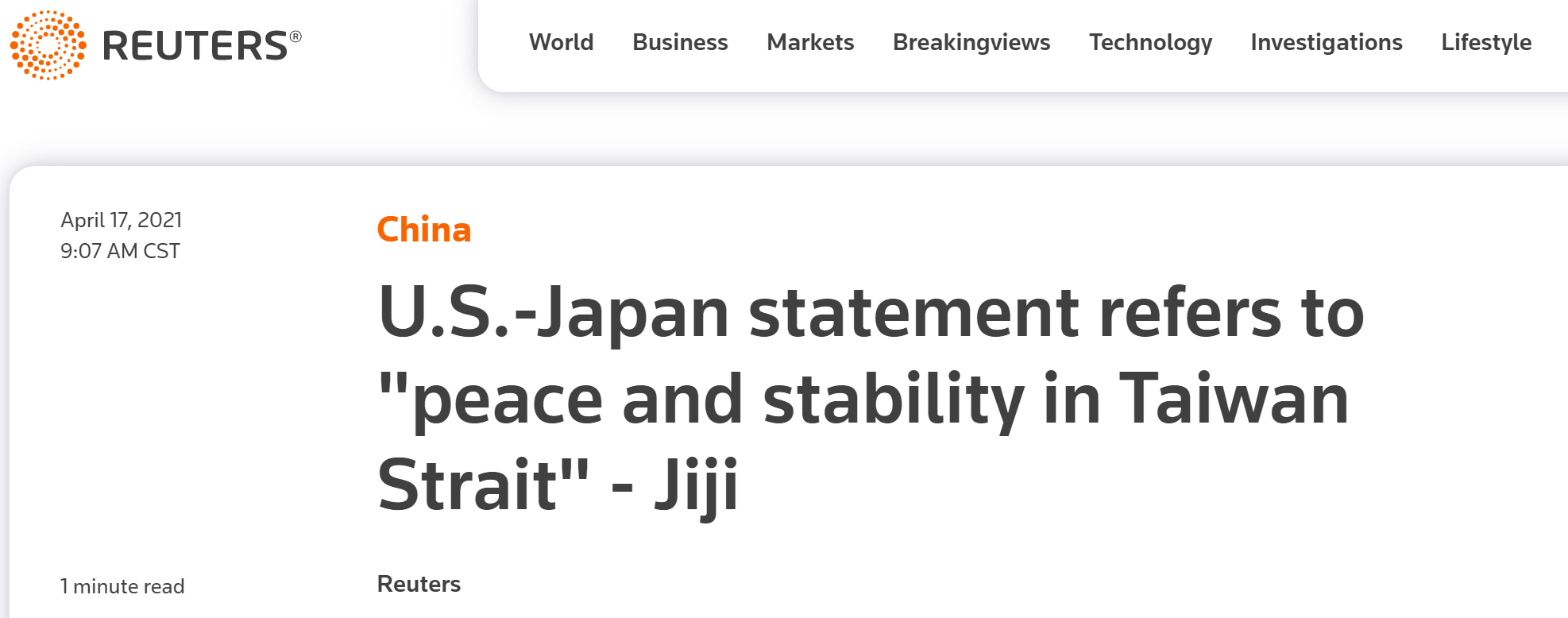 据此前媒体报道,1969年,时任日本首相佐藤荣作与时任美国总统尼克松在一份声明中称,台湾的安全对日本安全至关重要。 路透社在另一篇报道里提到,在当天的会晤中,“中国是首要议题”。报道称,在白宫玫瑰园举行的联合记者会上,拜登重申了“对美日同盟和共同安全的坚定支持”,“致力于共同应对来自中国的各种挑战”,宣称“以确保自由开放的印度太平洋的未来”。