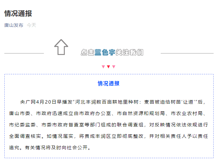 4月20日上午,总台央广中国之声独家报道了“河北唐山市丰润区政府未征得村民同意,将数百亩长势良好的麦苗毁掉,强制村民在耕地上种树”的相关新闻,引发社会关注。 村民:此前栽种树苗开始连根拔掉 20日下午,多位涉事村庄的村民给总台央广中国之声记者反映称,他们庄稼地里此前栽种的树苗,开始被连根拔掉。现场施工人员比较忙碌,他们被要求三天内将此前栽种的树苗全部拔完 。 唐山官方回应:将全面调查核实 报道播出后,唐山官方就此作出回应:唐山市委、市政府迅速成立由市政府办公室、市自然资源和规划局、市农业农村局、市纪委监委、市委市政府督查室等部门组成的联合调查组,对反映情况依法依规进行全面调查核实。 如情况属实,将责成丰润区立即彻底整改,并对相关责任人予以责任追究。 有关情况将及时向社会公开。