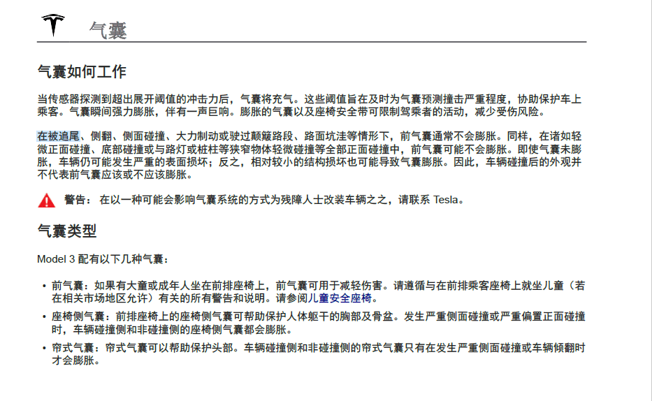 3)特斯拉车主手册有明确说明: 车辆碰撞侧和非碰撞侧的帘式气囊只有在发生严重侧面碰撞或车辆倾翻时才会膨胀。