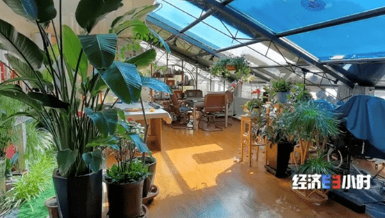 随后,这名工作人员带着记者参观了一个已经装修过的“大棚房”。从外面看起来,这是一个农业大棚,但里面一半的地面已经被硬化,地面上还铺设了木地板、摆上了桌椅,经过主人的装修,这里俨然成为了一间豪华阳光房。
