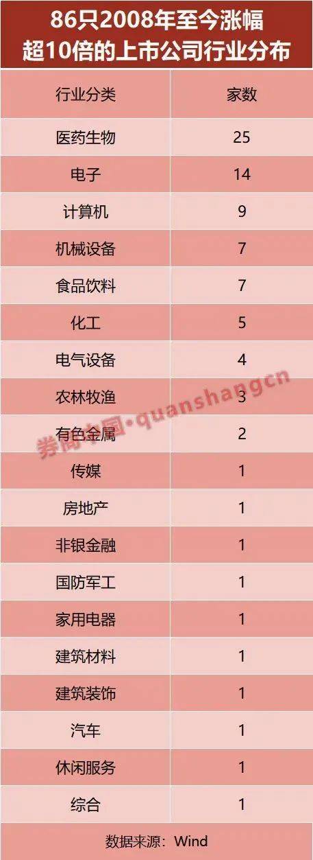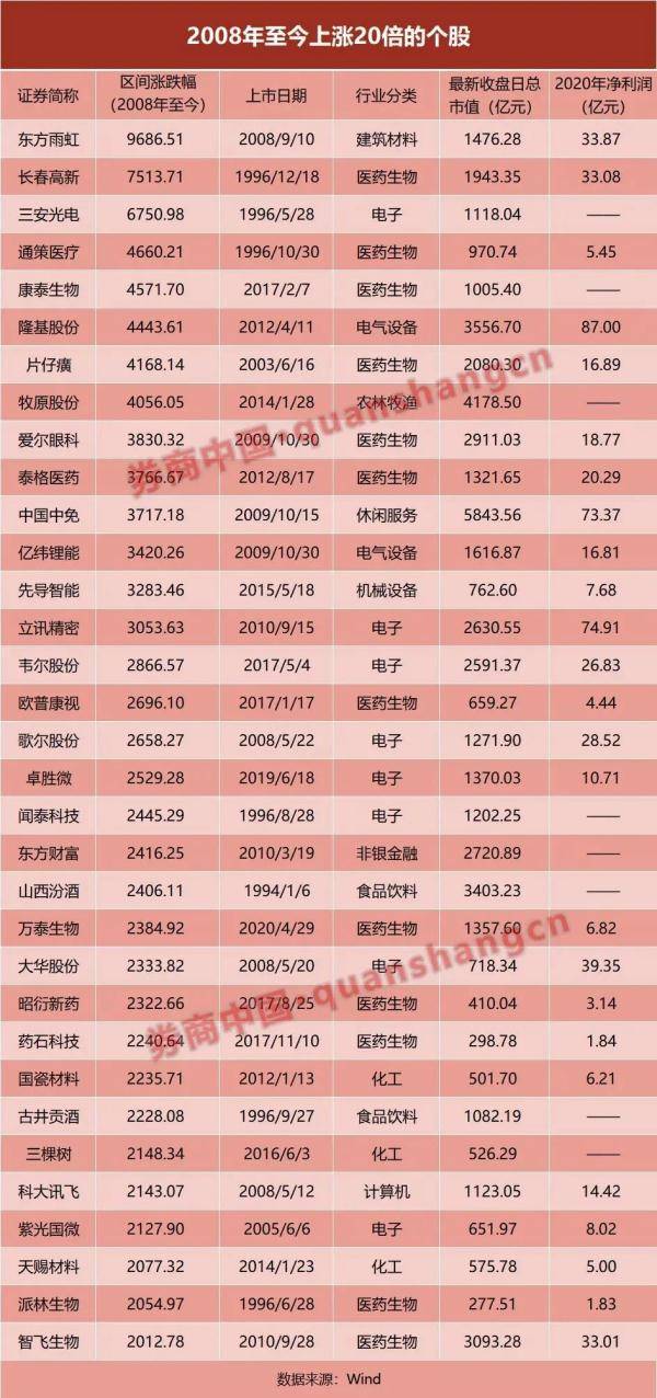 有86只个股13年间涨幅超10倍 根据Wind统计,2008年至今13年时间,涨幅超过10倍的个股共有86只。 其中,东方雨虹涨幅最高,上涨9687%。三安光电涨幅6751%。通策医疗、康泰生物、隆基股份、片仔癀均上涨超过40倍。