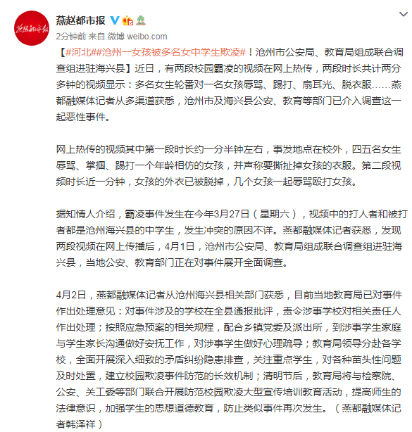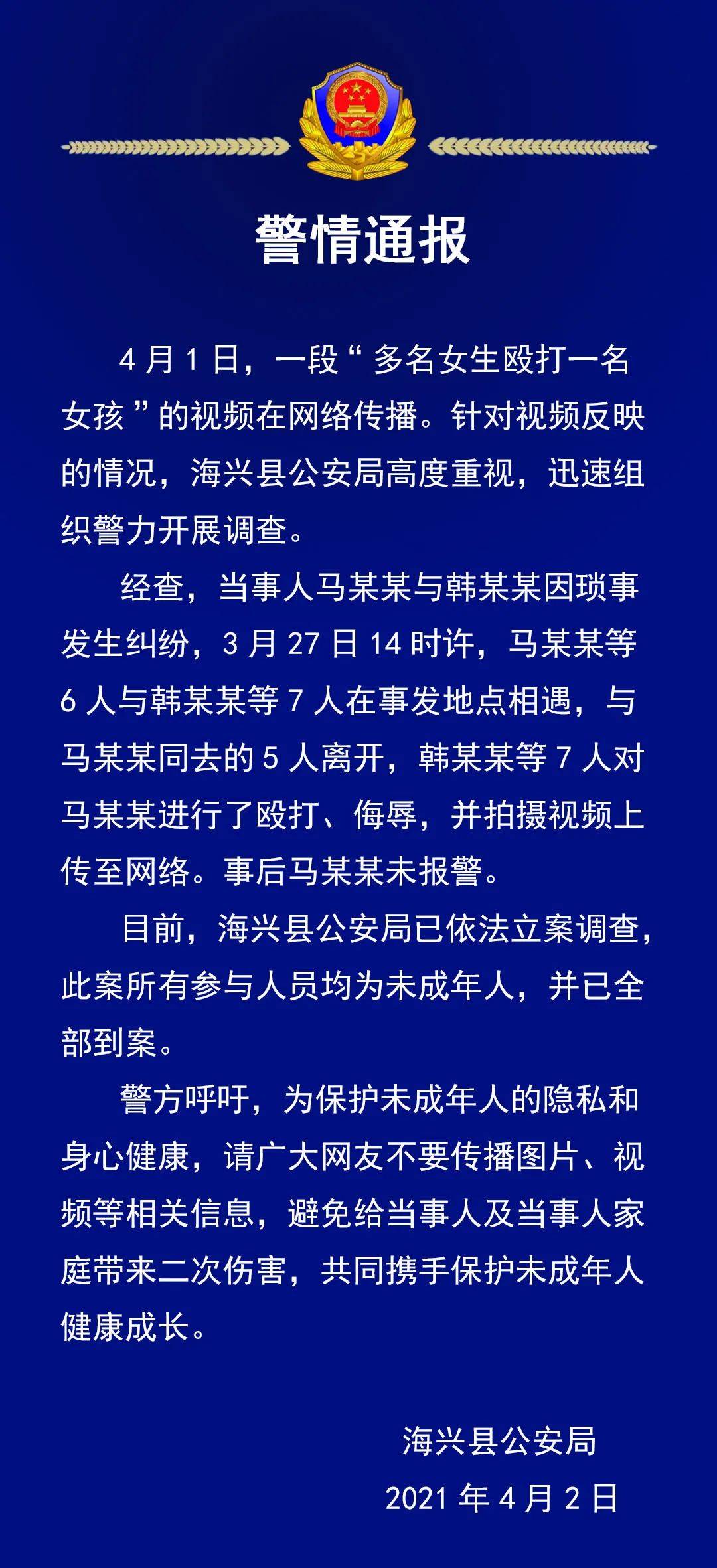 警情通报 4月1日,一段“多名女生殴打一名女孩”的视频在网络传播。针对视频反映的情况,海兴县公安局高度重视,迅速组织警力开展调查。 经查,当事人马某某与韩某某因琐事发生纠纷,3月27日14时许,马某某等6人与韩某某等7人在事发地点相遇,与马某某同去的5人离开,韩某某等7人对马某某进行了殴打、侮辱,并拍摄视频上传至网络。事后马某某未报警。 目前,海兴县公安局已依法立案调查,此案所有参与人员均为未成年人,并已全部到案。 警方呼吁,为保护未成年人的隐私和身心健康,请广大网友不要传播图片、视频等相关信息,避免给当事人及当事人家庭带来二次伤害,共同携手保护未成年人健康成长。 海兴县公安局 2021年4月2日 此前报道 沧州一女孩被多名女中学生欺凌,沧州市公安局、教育局组成联合调查组进驻海兴县 【#河北##沧州一女孩被多名女中学生欺凌#!沧州市公安局、教育局组成联合调查组进驻海兴县】近日,有两段校园霸凌的视频在网上热传,两段时长共计两分多钟的视频显示:多名女生轮番对一名女孩辱骂、踢打、扇耳光、脱衣服……燕都融媒体记者从多渠道获悉,沧州市及海兴县公安、教育等部门已介入调查这一起恶性事件。 网上热传的视频其中第一段时长约一分半钟左右,事发地点在校外,四五名女生辱骂、掌掴、踢打一个年龄相仿的女孩,并声称要撕扯掉女孩的衣服。第二段视频时长近一分钟,女孩的外衣已被脱掉,几个女孩一起辱骂殴打女孩。 据知情人介绍,霸凌事件发生在今年3月27日(星期六),视频中的打人者和被打者都是沧州海兴县的中学生,发生冲突的原因不详。燕都融媒体记者获悉,发现两段视频在网上传播后,4月1日,沧州市公安局、教育局组成联合调查组进驻海兴县,当地公安、教育部门正在对事件展开全面调查。 4月2日,燕都融媒体记者从沧州海兴县相关部门获悉,目前当地教育局已对事件作出处理意见:对事件涉及的学校在全县通报批评,责令涉事学校对相关责任人作出处理;按照应急预案的相关规程,配合乡镇党委及派出所,到涉事学生家庭与学生家长沟通做好安抚工作,对涉事学生做好心理疏导;教育局领导分赴各学校,全面开展深入细致的矛盾纠纷隐患排查,关注重点学生,对各种苗头性问题及时处置,建立校园欺凌事件防范的长效机制;清明节后,教育局将与检察院、公安、关工委等部门联合开展防范校园欺凌大型宣传培训教育活动,提高师生的法律意识,加强学生的思想道德教育,防止类似事件再次发生。(燕都融媒体记者韩泽祥)