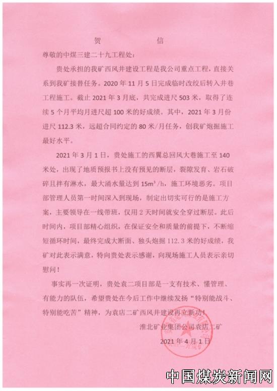 | 中煤三建二十九处袁二项目部高效施工喜获贺信 | |||