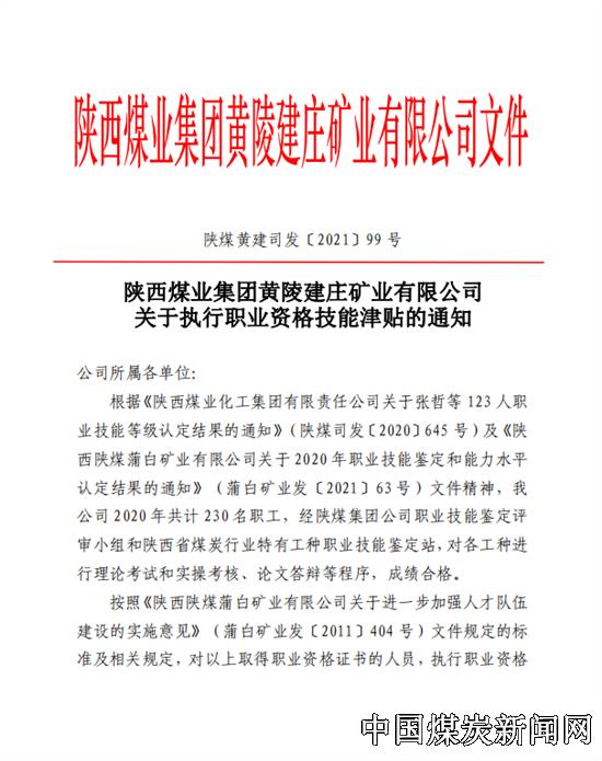 【本网讯】近日,陕西蒲白建庄矿业公司针对新增的230名取得职业资格证书的职工,全部执行职业资格技能津贴。职业资格技能津贴自2021年1月1日起按月执行。同时,对取得技师资格证书的人员,一次性给予2000元奖励。