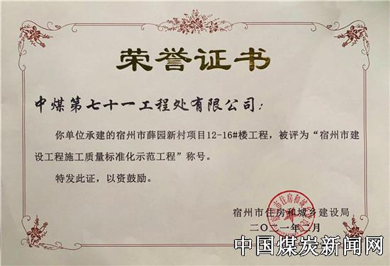 | 中煤七十一处薛园新村项目荣获“宿州市建设工程质量标准化示范工程”称号 | |||