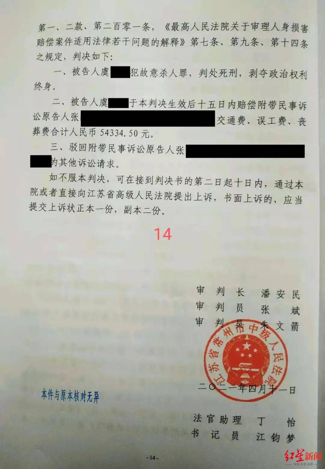 ▲被害人陈老太生前所住的房间。红星新闻记者 陈卿媛 摄 张某甲证言,他看到视频后非常震惊,之后当面质疑保姆虞某为什么要将他母亲闷死,虞某不承认,家人告诉虞某房间内有监控,虞某“吓得不说话了”。 张某乙告诉红星新闻记者,虞某在开庭审理时认罪,并讲述了她接下2020年5月3日上班单子的情节,称自己“一时糊涂”杀害了老太,希望法院能从轻处罚。 法院最后认定的事实为,虞某故意剥夺他人生命,致一人死亡,虞某归案后虽如实供述罪行,认罪认罚,但鉴于虞某犯罪手段残忍,情节恶劣,不予从宽处理。 2021年4月11日,常州市中级人民法院判虞某犯故意杀人罪,处死刑,剥夺政治权利终身;虞某赔偿附带民事诉讼原告人各项经济损失共计5.4余万元;驳回附带民事诉讼中原告人(陈老太的四个子女)的其他诉讼请求。 4月30日,张某乙告诉红星新闻记者,家属的诉求一直是判处虞某死刑,今日收到判决书后,对判决结果满意,“判决彰显了法律的威严,也算是给社会的一个明确的交代。后天就是老太的忌日,可以告慰亡灵了。”