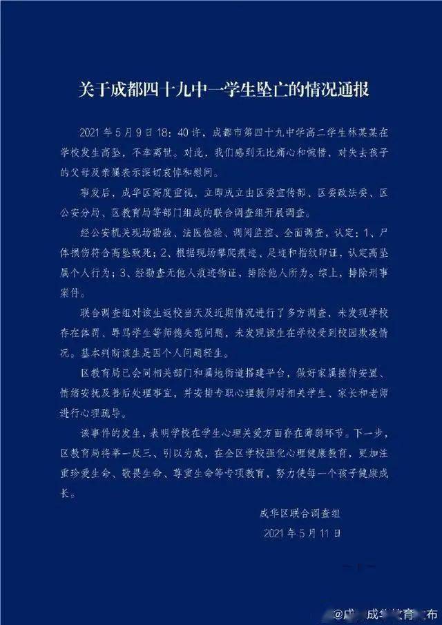 相关报道 官方凌晨通报:排除刑案,未发现受到校园欺凌 来源:人民日报 据成都市成华区教育局官方微博5月11日3:54通报,经联合调查组全面调查认定,成都49中高二学生林某某在学校发生高空坠亡属个人行为,排除刑案;未发现存在体罚、辱骂等师德失范问题,未发现该生受到校园欺凌情况。 调查组指出,该事件表明,学校在学生心理关爱方面存在薄弱环节。