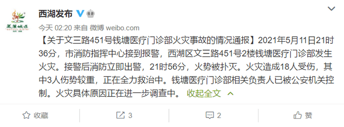 视频截图 此前,@西湖发布 发布情况通报:2021年5月11日21时36分,市消防指挥中心接到报警,西湖区文三路451号2楼钱塘医疗门诊部发生火灾。接警后消防立即出警,21时56分,火势被扑灭。火灾造成18人受伤,其中3人伤势较重,正在全力救治中。钱塘医疗门诊部相关负责人已被公安机关控制。火灾具体原因正在进一步调查中。