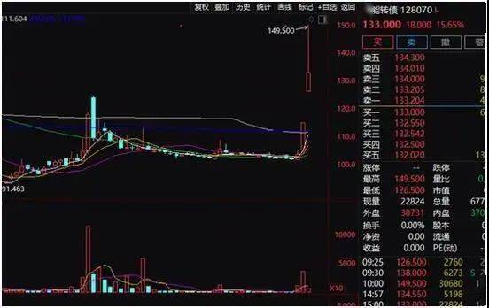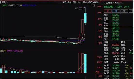 相较于智能转债,正元转债、久吾转债等可转债的盘中涨势一度更猛,这两只可转债在3天的时间里一度翻倍。 行情数据显示,上周四,正元转债一度低至117.23元,但其价格今天盘中一度达到237.60元,短短3天也一度翻了一倍,不过其后跳水,收盘时反而下跌6.06%。在价格巨震的同时,成交额也急速放大。上周五之前的多个交易日,正元转债的日成交额多为几千万元到2亿元,但从上周五开始,每天的成交额都超过50亿元,较以往放大了数十倍。